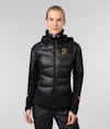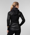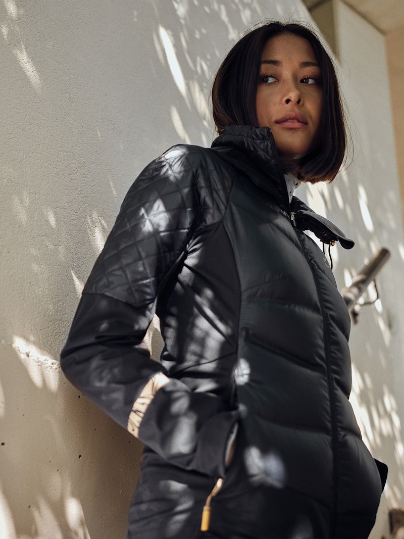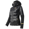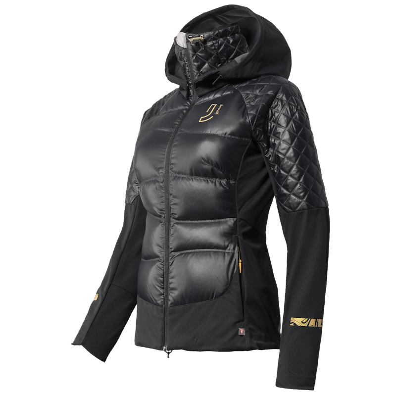 Feminine and sporty winter training jacket for skiing or other outdoor activities. Highly elastic softshell fabric with a down insulated front and back for warmth on colder days. Insulated Primaloft Gold panels on sleeves and collar with ultrasonic quilting for extra warmth, perfect as a ski jacket during winter. Elastic underarm and back panels provides maximum mobility. High warming adjustable collar with detachable and adjustable hood for extra weather protection. Extended hem in the back to keep you warm. Warming hand pockets with zip. Feminine and flattering fit. Sparkled with metallic details and feminine reflective prints for dark winter nights.