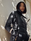 Designet med metalliske detaljer, vattert mønster på skuldrene, og et feminint snitt.