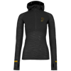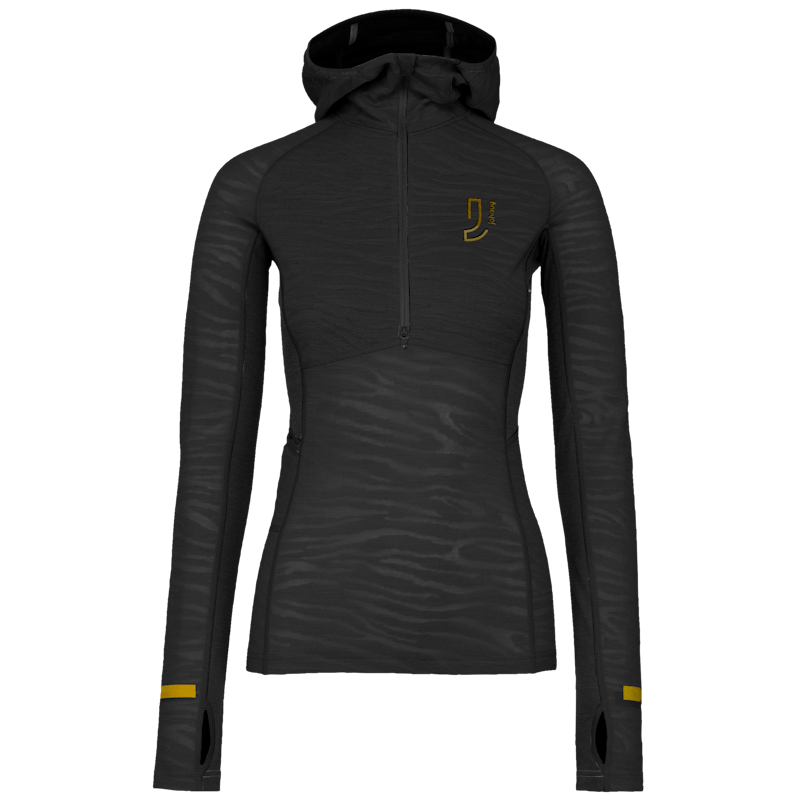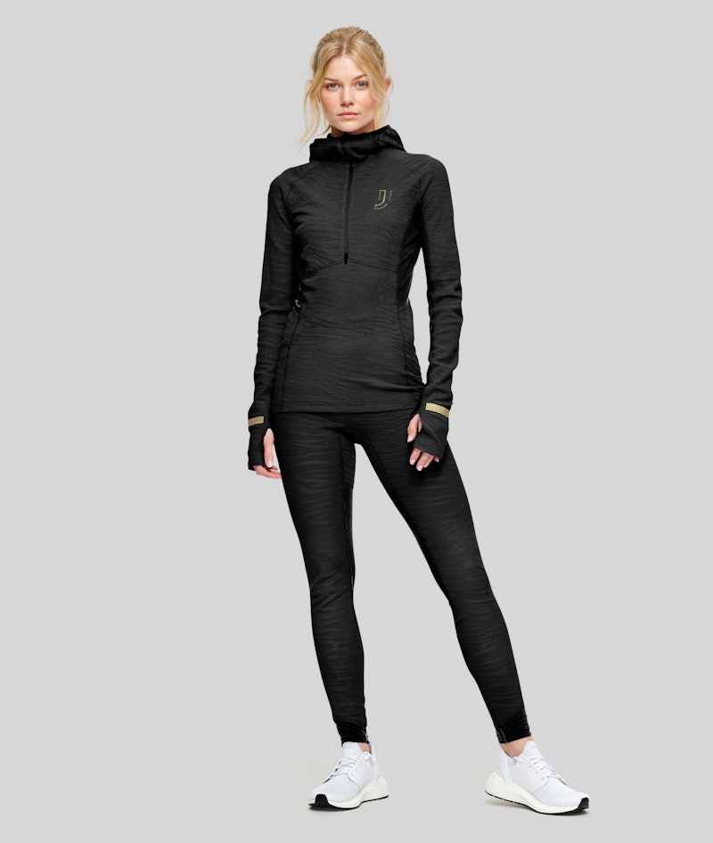 Feminine and sporty half zip hood baselayer. Features a technical blend of wool and synthetics knitted with zonal function.