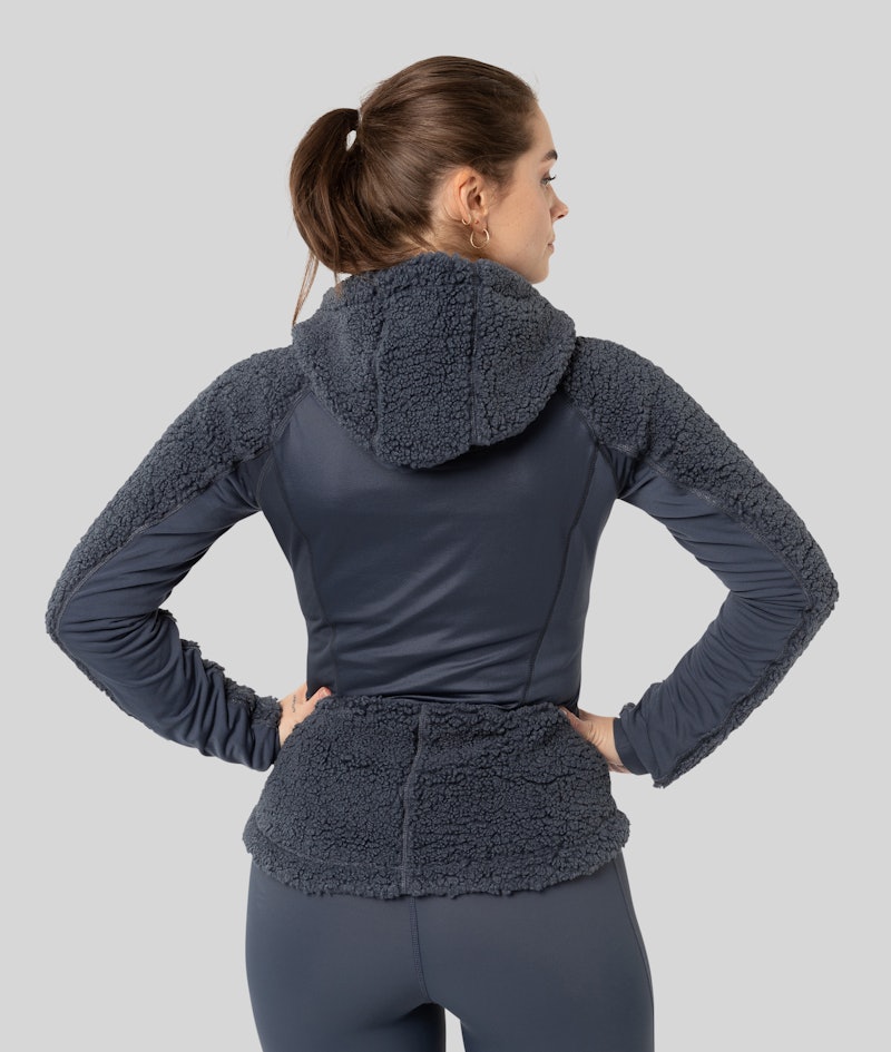 Feminine and sporty hooded pile fleece jacket. Improved version of Zonal Hybrid Fullzip Hood with better fitting and true-to-size. Features elastic and warming side panels and a wicking back-panel. Use it as a midlayer for training, or a sporty everyday look.