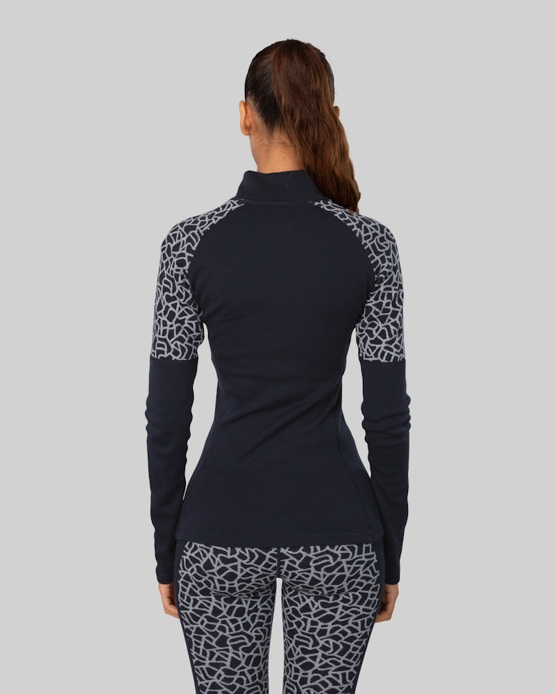 Soft and warm baselayer with half zip and iconic Johaug print in 100% merino wool. Feminine and flattering fit. Designed for outside training or indoor use, makes you feel comfortable anywhere.