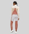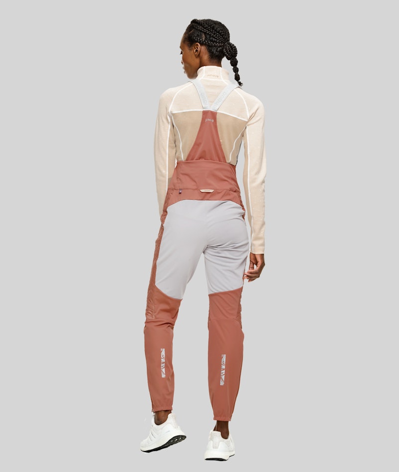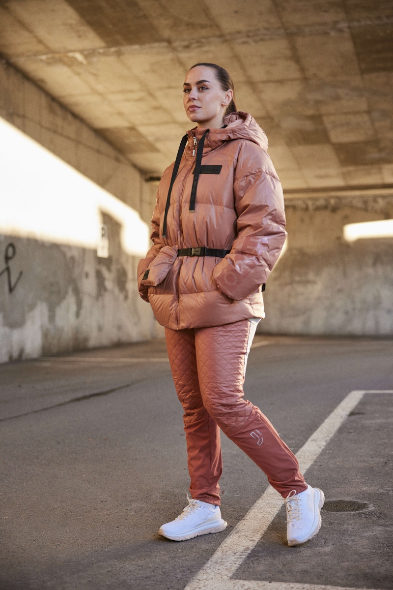 Feminine and sporty winter training pants for skiing or other outdoor activities. Insulated primaloft panels in front with ultrasonic quilting for extra warmth on colder days, perfect as a skiing pant. High and comfortable waist with detachable suspenders will keep you warm and chic. Warming, breathable and highly elastic back panels for maximum mobility and comfort. Feminine fit and flattering cut. Practical bottom leg zippers. Sparkled with metallic details and feminine reflective prints for dark winter nights.
