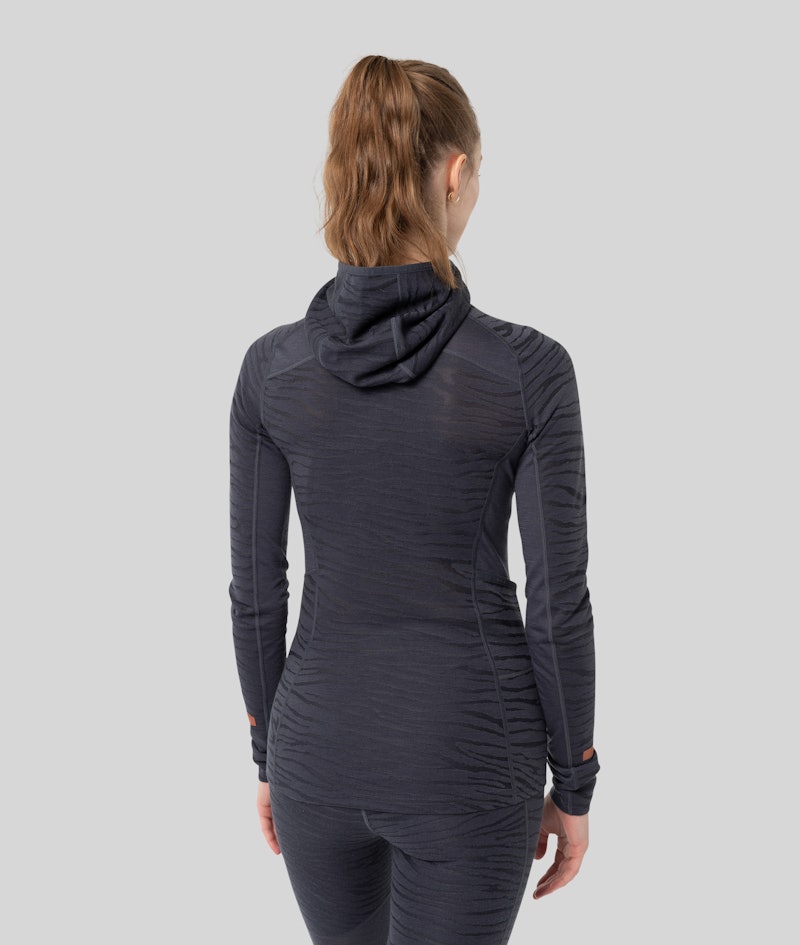 Feminine and sporty half zip hood baselayer. Features a technical blend of wool and synthetics knitted with zonal function.