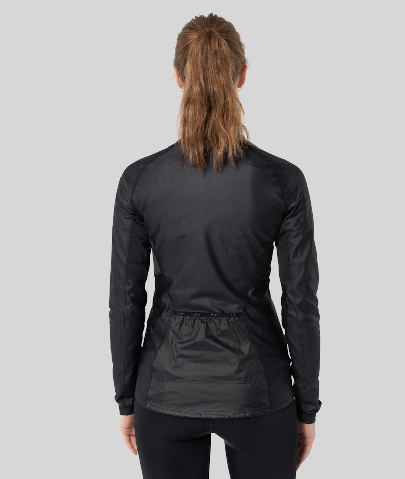 Light and warming midlayer for outdoor training. The front has a soft and comfortable fabric with a luxurious shine, insulated with warming Primaloft material. Features a long 2-way zipper in front for ventilation, windproof panel in the back with pocket and breathable underarm panelling for maximum movement and comfort. Feminine and flattering fit. Sparkled with reflective prints for dark conditions.